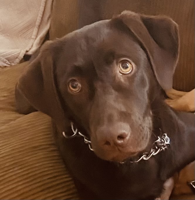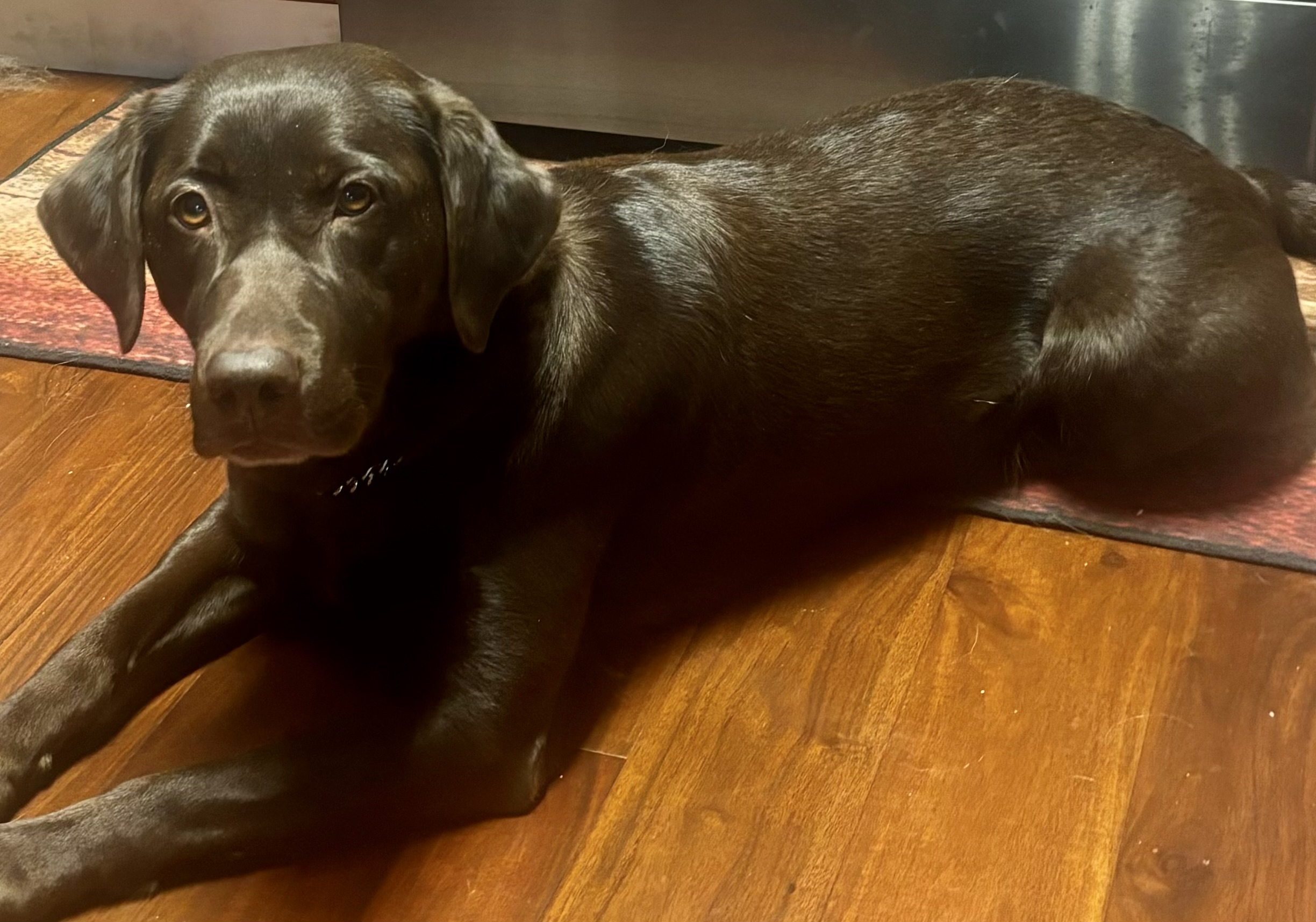 Lola is a 61-pound dark chocolate Labrador Retriever with short, closely cropped hair and a blocky, intelligent-looking head. She embodies warmth and devotion, forming deep bonds with everyone she meets.