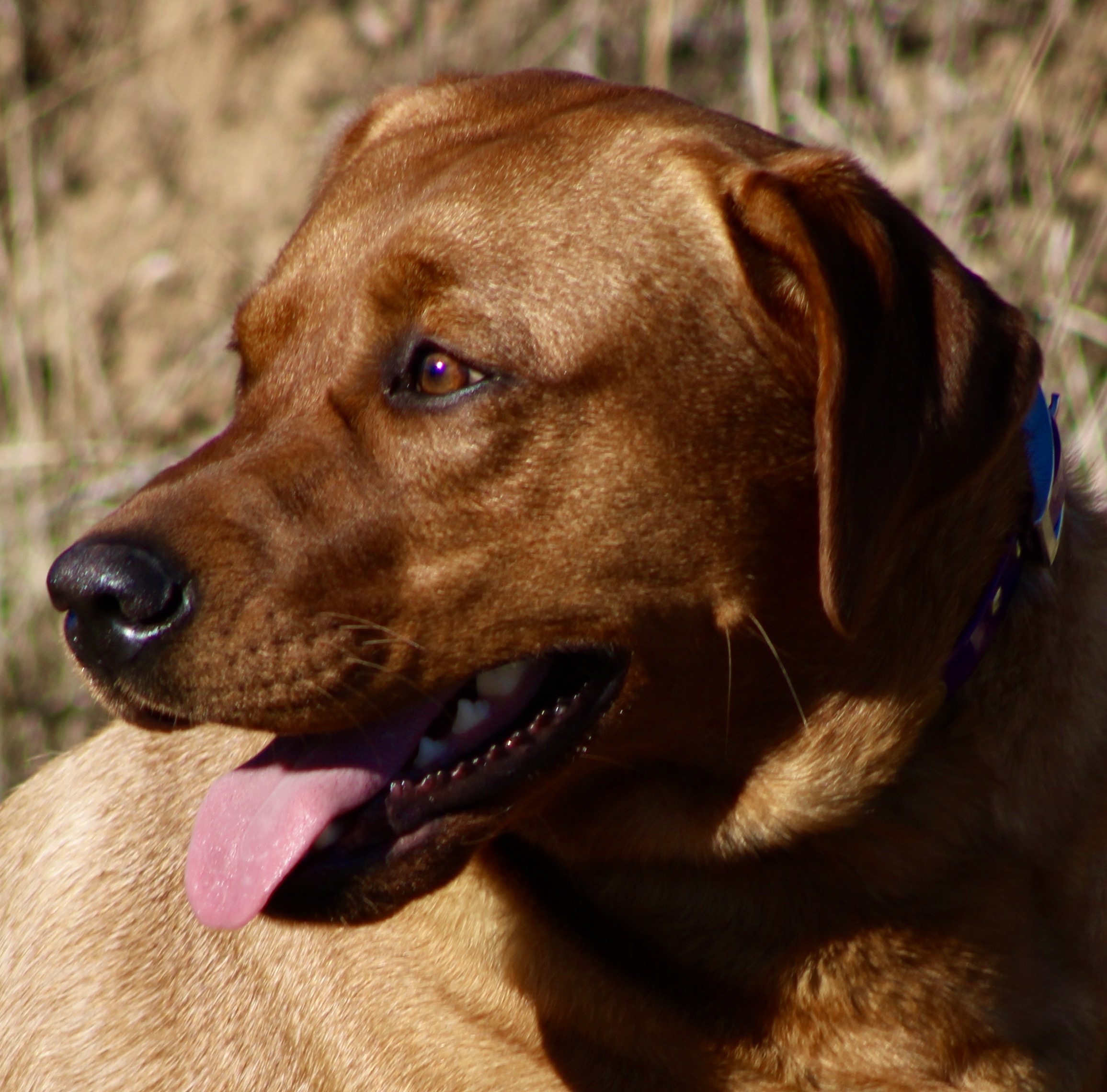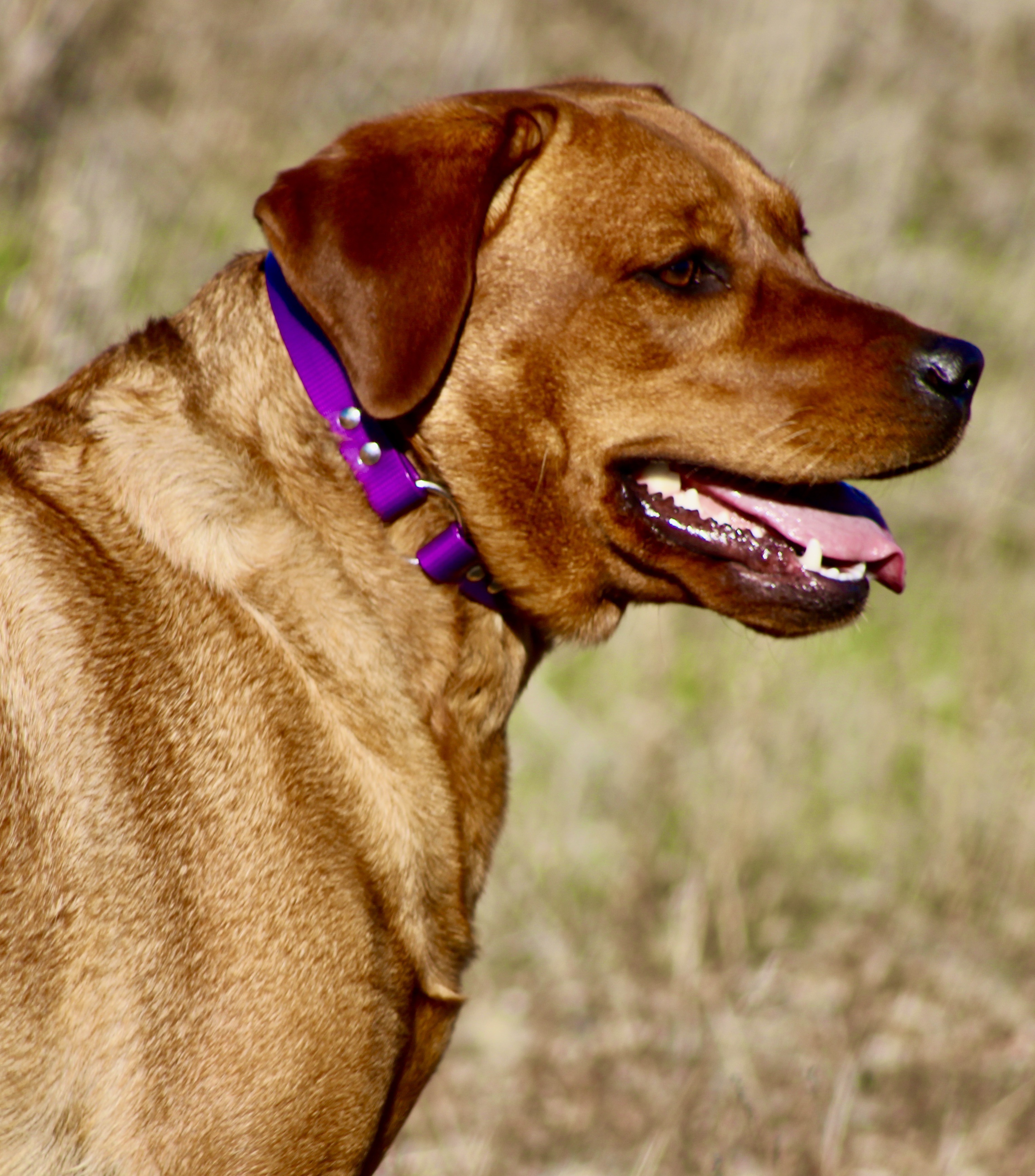 Pebbles was born at Marble Mountain Kennels in California, as a result of a breeding between SC’s “Trojan” of Marble Mountain (Y)SR93595703 and “Rose”of Marble Mountain(R)*. Pebbles is a 70-pound Fox Red Labrador Retriever who is sweet, curious, and gentle. She is outgoing but also has a calm and loving personality. She is responsive, alert and very, very affectionate. She has a blocky head and body on a 70-pound frame, with a dark delicious fox red color. Pebbles family described her as a very nice house dog who has good in-home mannerisms and say that her main fault is that she wants all love and gets jealous when the other dogs are getting loved on.Pebbles three strongest traits her good looks, her even temperament and desire to please.